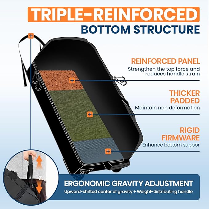 - Stable Travel Assistant: This duffel bag redefines design with innovation, upgrading the support structure to prevent deformation.Why is it more trustworthy? Its triple-reinforced bottom ensures firmness when fully loaded, solving common sagging and dragging issues. Ergonomically adjustable handle connect to the reinforced base, enhancing load-bearing capacity, shifting the center of gravity upward, and distributing weight for effortless. Let you easily pull in the most comfortable posture