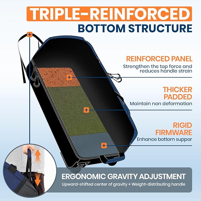 • Stable Travel Assistant: This duffel bag redefines design with innovation, upgrading the support structure to prevent deformation.Why is it more trustworthy? Its triple-reinforced bottom ensures firmness when fully loaded, solving common sagging and dragging issues. Ergonomically adjustable handle connect to the reinforced base, enhancing load-bearing capacity, shifting the center of gravity upward, and distributing weight for effortless. Let you easily pull in the most comfortable posture