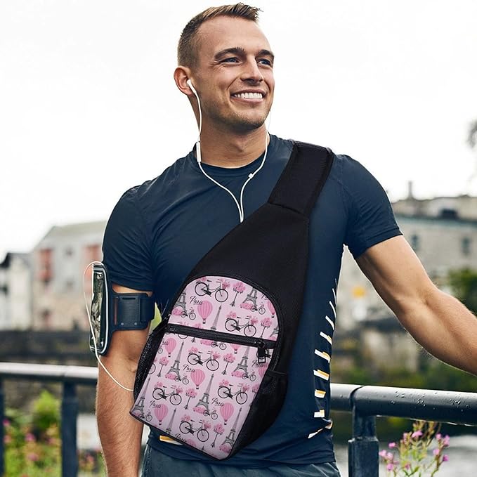 SWEET TANG Lightweight Sling Shoulder Backpack, Adjustable Gym Bags Pink Paris Eiffel Tower, Large Capacity Chest Cross Body Bag Daypack, Outdoor Multipurpose Bag