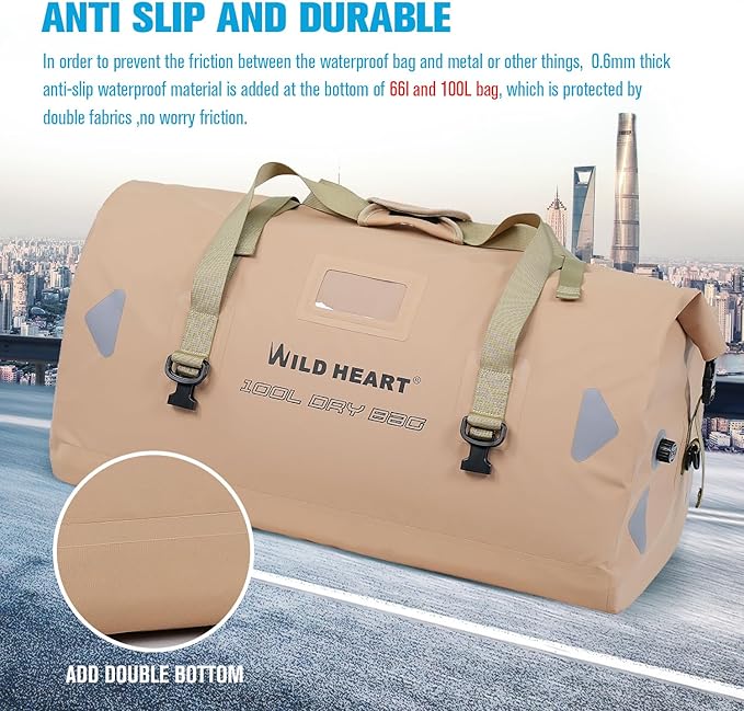 WILD HEART Waterproof Motorcycle Duffel Bag PVC500D Double-bottom With Rope Straps and Inner Pocket 40L 66L 100L for Kayaking, Camping, Boating,Motorcycle