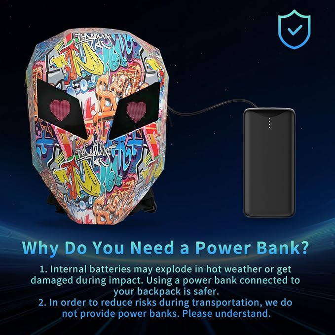 - ๐ Easy Setup with Universal Power Compatibility Lighting up your backpack is simple: just connect it to any standard power bank (not included) via the built-in USB port. The universal compatibility means you can easily use a portable charger you already own to bring your vibrant designs to life.