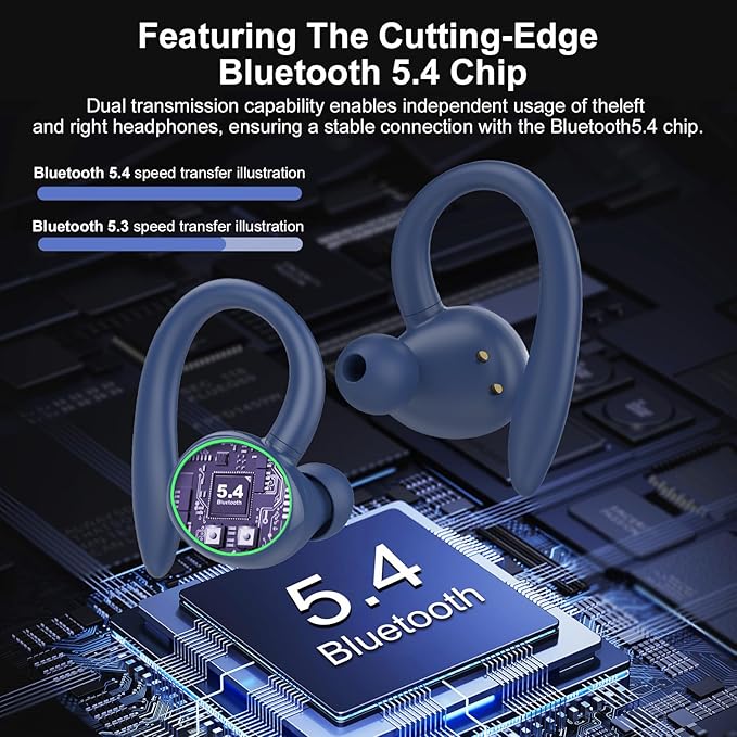 Wireless Earbuds, Bluetooth 5.4 Headphones Sport, Over Ear Buds With ENC Noise Cancelling Mic, 48H, Wireless Earphone With Earhooks, Stereo Deep Bass, IP7 Waterproof Headset for Workout Running, Blue