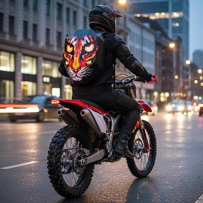 Motorcycle Backpack with LED Eyes, DIY Laptop Backpack for Riding, Cycling, Travel, Waterproof Hard Case Motorbike Bag, Large Size 19" Tiger