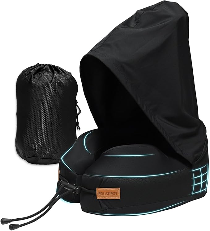 Travel Pillow with Hood, Memory Foam Airplane Neck Pillow for Long Flight, Soft, Comfort Portable Travel Neck Pillow for Flight, Drive, Work, Rest, with Storage Bag