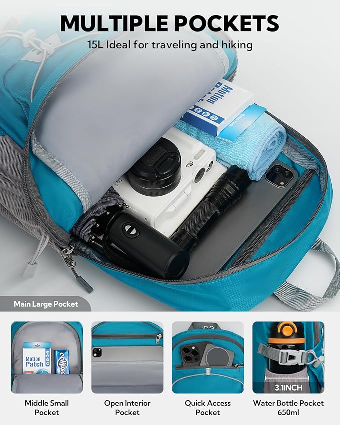 WATERFLY Small Lightweight Packable Backpack: 15L Mini Ultra Light Foldable Travel Daypack with Breathable Shoulder Strap Outdoor Hiking Camping Day Pack for Women Men Blue