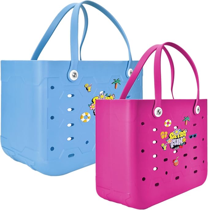 • 【2-Piece Set with Drainage Holes - Your Ultimate On-the-Go Companion】This practical set includes one medium tote (13.97") and one large tote(17.91") , perfect for organizing your beach day or poolside essentials. The innovative all-over holes allow water to drain and sand to shake out instantly, keeping your belongings dry and sand-free. No more soggy, heavy bags!