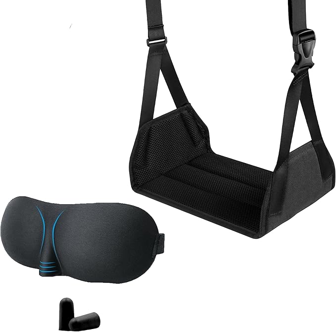 - Advanced Features for Instant & Customizable Comfort: Experience unparalleled comfort tailored to your needs. The airplane foot hammock features an adjustable strap for customizable calf, ankle, or arch support. The 3D contoured eye mask with memory foam nose wings creates a perfect blackout seal to block out all light completely. Combined with high-fidelity noise-canceling ear plugs that isolate sound, you gain full control over your environment for instant relaxation anywhere.