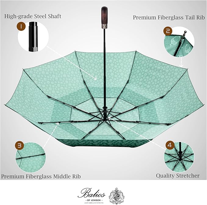 Balios Travel Folding Umbrella with Real Wood Handle Auto Open Close Vented Windproof Canopy - Designed in UK
