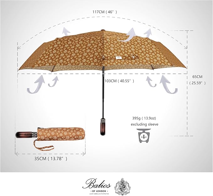 Balios Travel Folding Umbrella with Real Wood Handle Auto Open Close Vented Windproof Canopy - Designed in UK
