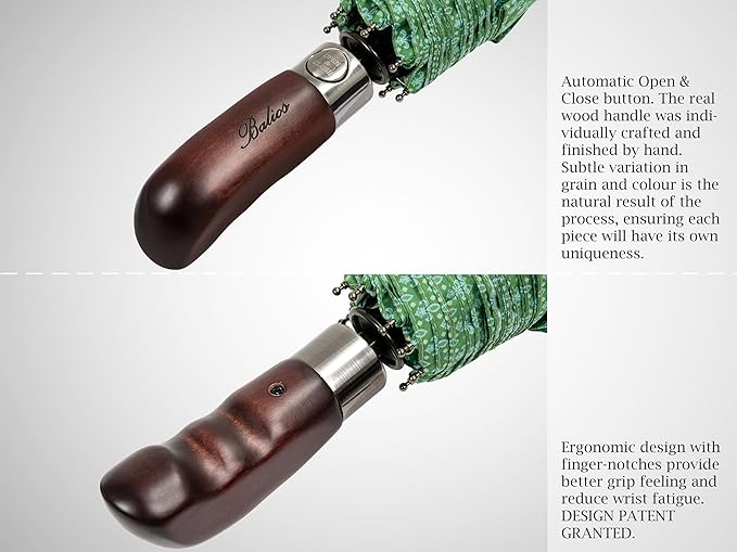Balios Travel Folding Umbrella with Real Wood Handle Auto Open Close Vented Windproof Canopy - Designed in UK