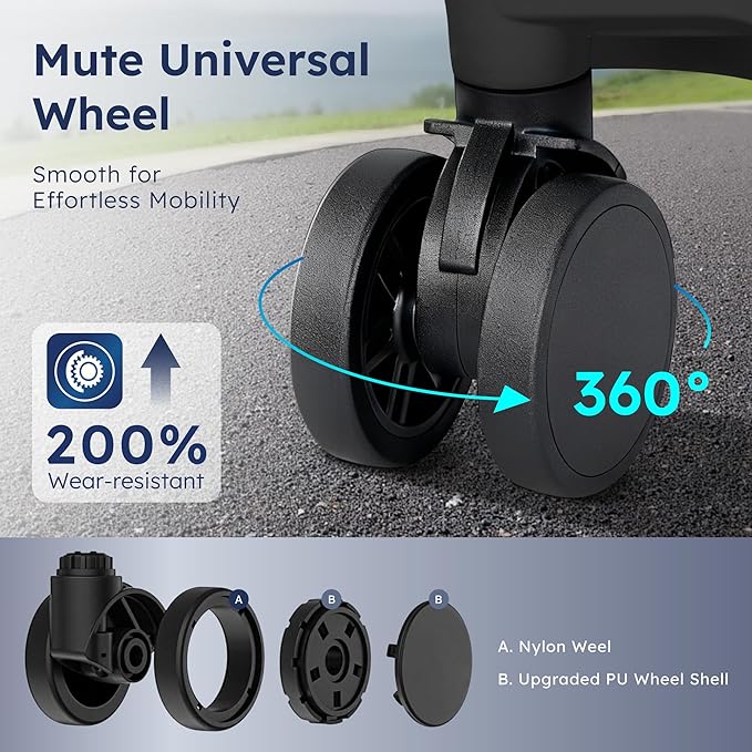 - Silent Spinner Wheels: We feature four of the most advanced 360° smooth-rotation silent dual wheels on the market, delivering unmatched smoothness and effortless maneuverability. They glide steadily and easily across various surfaces. Best of all, the wheels come pre-installed—ready to use right out of the box