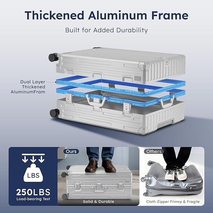 - Premium PC + Aluminum Frame Materials: This combination is remarkably lightweight yet reinforced to resist warping. Four sturdy aluminum corner guards absorb impact from rough handling during transit. Our high-quality aluminum telescopic handle ensures a smooth, reliable pull and significantly reduces the risk of breaking. With near-metallic sheen panels and a frame that are 22% thicker than standard, your valuables are perfectly protected, elevating your entire travel experience