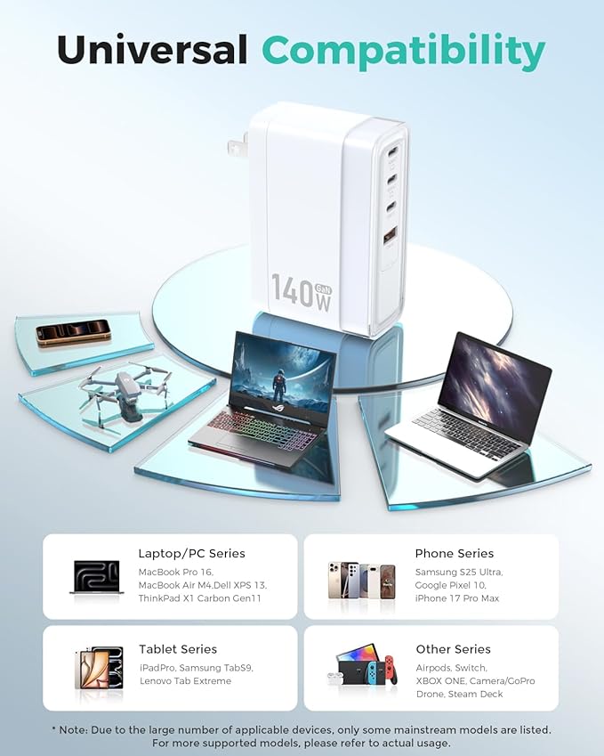 - 4-IN-1 Charger for Travel Essentials: One compact charger effortlessly powers your Laptop (140W/C1), Tablet (100W/C2), Phone (30W/C3), and Accessories (27W/A1). The intelligent chip automatically allocates the optimal wattage when charge them simultaneously,ensuring every device in your lineup gets the fast charge it deserves. Simplify your life and power everything with one.Essentials for travel,office desk,dorm room,nightstand,cruise,RV,camping,vacation,road trip,college