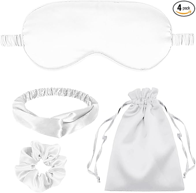 - PERFECT COMBINATION: The package contains: 1xsilky satin sleep eye mask, 1xpouch bag, 1xheadband, 1xhair scrunchies=TOTAL 4PCS PER PACK. Lightweights and portable travelling accessories, allowing you for the relaxation and feel refreshed during the travel or the nap.
