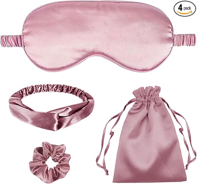 - PERFECT COMBINATION: The package contains: 1xsilky satin sleep eye mask, 1xpouch bag, 1xheadband, 1xhair scrunchies=TOTAL 4PCS PER PACK. Lightweights and portable travelling accessories, allowing you for the relaxation and feel refreshed during the travel or the nap.