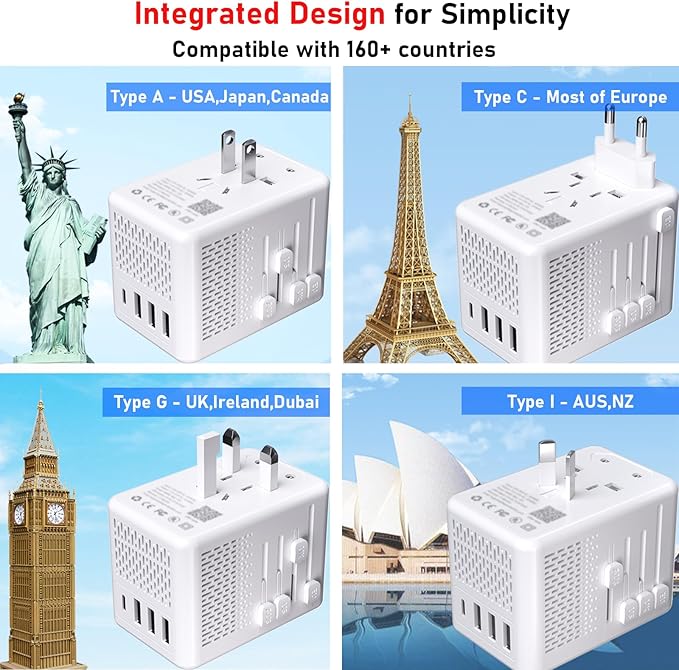 - Global Voltage Converter: Just 3.35×2.16×2.55 inches and 0.5 lbs, compatible with outlets in 200+ countries. The Type C plug is compatible with destinations like France, Germany, Italy, Spain, Portugal, Greece, Austria, the Netherlands, and more. The Type A plug works in the USA, Canada, Japan, Mexico, the Philippines, and beyond. Type G is tailored for the UK, Ireland, England, Singapore, and other regions. The Type I plug is designed for use in Australia, Argentina, China, and more.