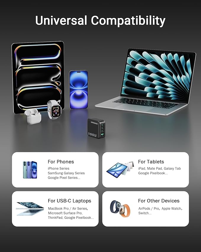 - What You Get: UNIWEI Kuafu Charger (100W, 4Ports, GaN), welcome guide, our worry-free 12-month warranty, and friendly customer service.