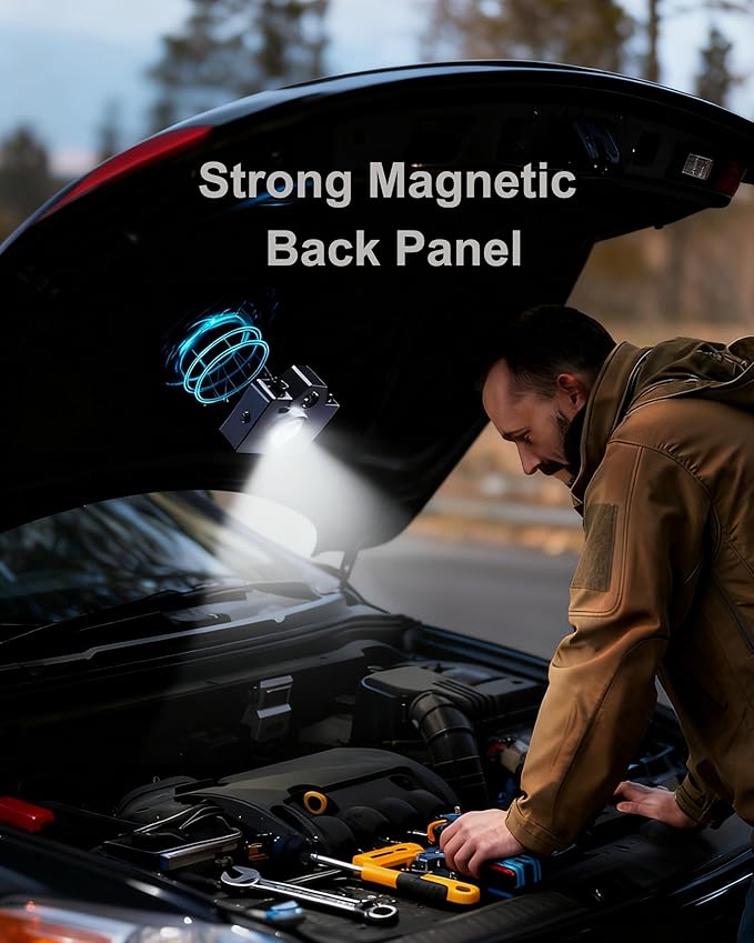 - 【COB LED Chip: A Camping Lantern with Wide-Angle & Focused Lighting】This camping lantern features a high-efficiency COB LED chip, delivering more uniform and brighter light than traditional single-LED flashlights. It pairs a flood lens for 120° wide-angle soft light (ideal for illuminating entire tent or camping areas) and a spotlight lens for long-range beam penetration (great for outdoor searches or work light needs). As magnetic rechargeable led lights, it offers stable performance—attach it to metal surfaces (like car bodies) for hands-free work, or use it as a standalone lantern for outdoor nights.