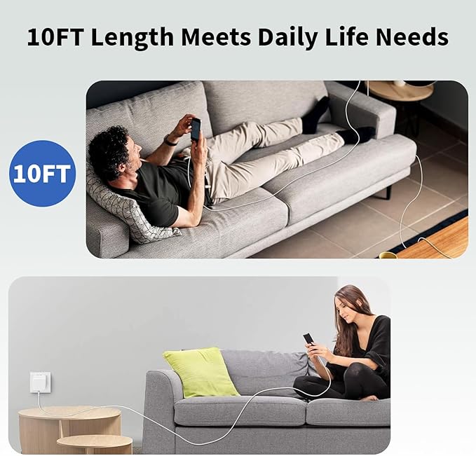 - 【All-in-One Kit: Charger+10FT/3Meter 60W USB C-C Cable】This wall charger comes with everything you need:1 fast-charging usb c charger adapter and a 10FT 60W long usb c cable—no extra purchases required, just plug and play.The extended usb c cable length offers flexibility,letting you charge comfortably from afar(couch, bed, desk)for daily or travel needs.It’s a complete charger kit solution that pairs perfectly with your iphone 17 charger, iphone 16 charger, iphone 15 charger compatible devices.