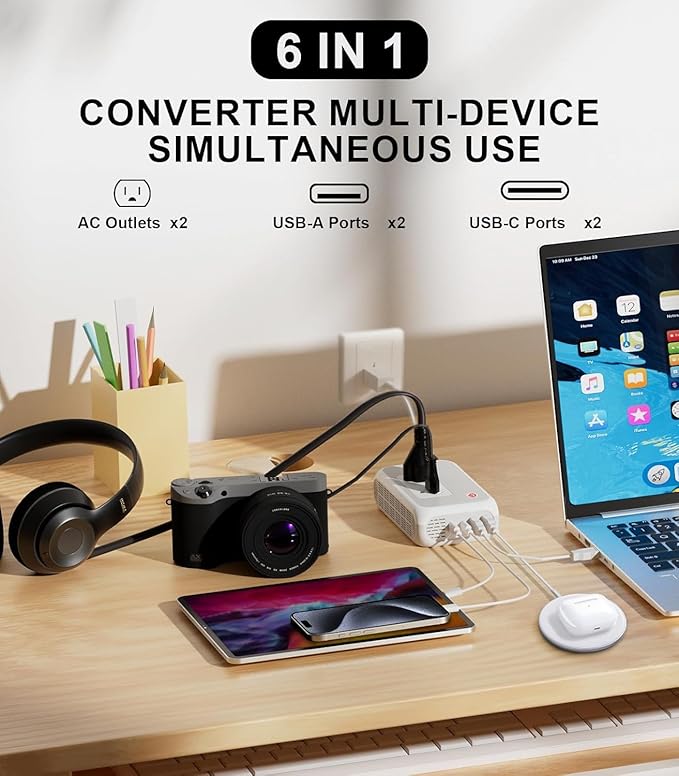 - 6-in-1 International Power Converter: Mapambo 220V to 110V converter features 2 U.S. AC outlets, 2 USB-A ports, and 2 USB-C ports, allowing you to charge up to 6 devices simultaneously. It's perfect for powering all your travel essentials, including phones, tablets, laptops, cameras, gaming consoles, speakers, smartwatches—even hearing aids.