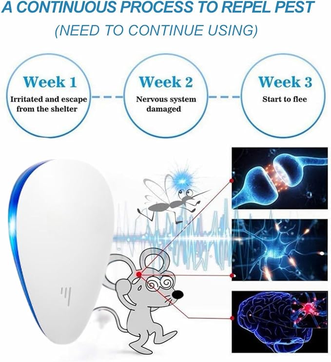 - Drive Pests Away Efficiently: the mice repellent ultrasonic plug-in uses ultrasonic waves to irritate pests' brain and auditory systems, creating an uncomfortable environment that effectively drives away fleas, rodents, insects, mosquitoes, ants, bed bugs, and more