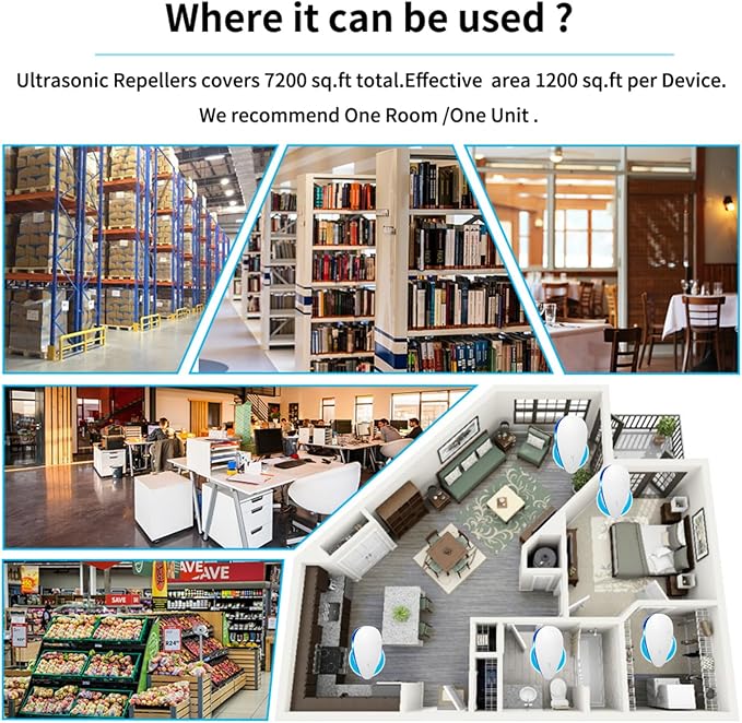 - Wide Coverage : It is effective up to an area of 1600 SQ; put one in each room as ultrasound can not penetrate through walls and solid objects spaces such as garages, kitchens, attics, barns, and RVs