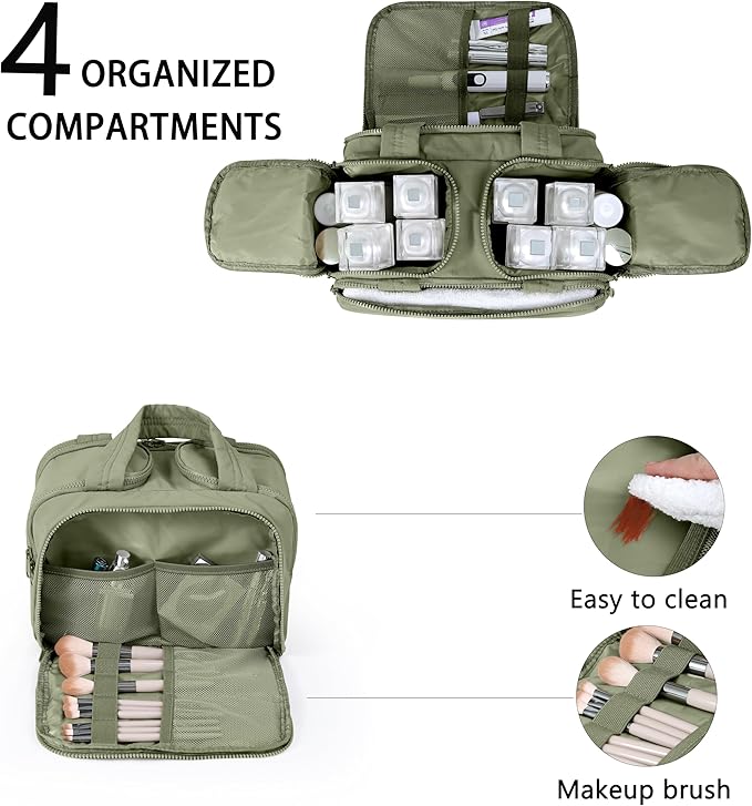 - 【Spacious and Organized Storage】 Designed with two zippered compartments to organize your travel-sized bottles or cosmetics, each with 3 mesh pockets to keep everything upright and leak-free. The front pocket includes a row of elastic brush slots to neatly hold and protect your makeup brushes, plus 2 roomy mesh pockets for quick access to toiletries or makeup items.