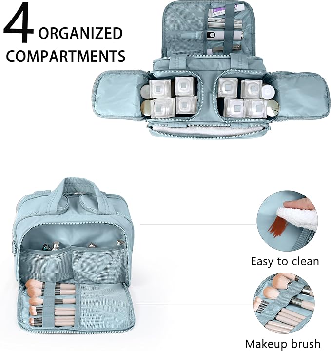 - 【Spacious and Organized Storage】 Designed with two zippered compartments to organize your travel-sized bottles or cosmetics, each with 3 mesh pockets to keep everything upright and leak-free. The front pocket includes a row of elastic brush slots to neatly hold and protect your makeup brushes, plus 2 roomy mesh pockets for quick access to toiletries or makeup items.