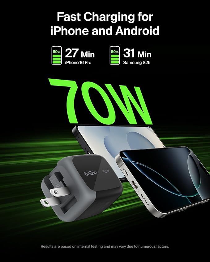 - FAST CHARGING TECHNOLOGY: 3-port wall charger uses USB-C PD3.1 to rapidly charge iPhone 16 from 0-50% in 27 minutes and MacBook Air from 0-50% in 41 minutes.* Also supports Samsung Super Fast Charging for Galaxy S25, plus charging for Pixel 10 and more.
