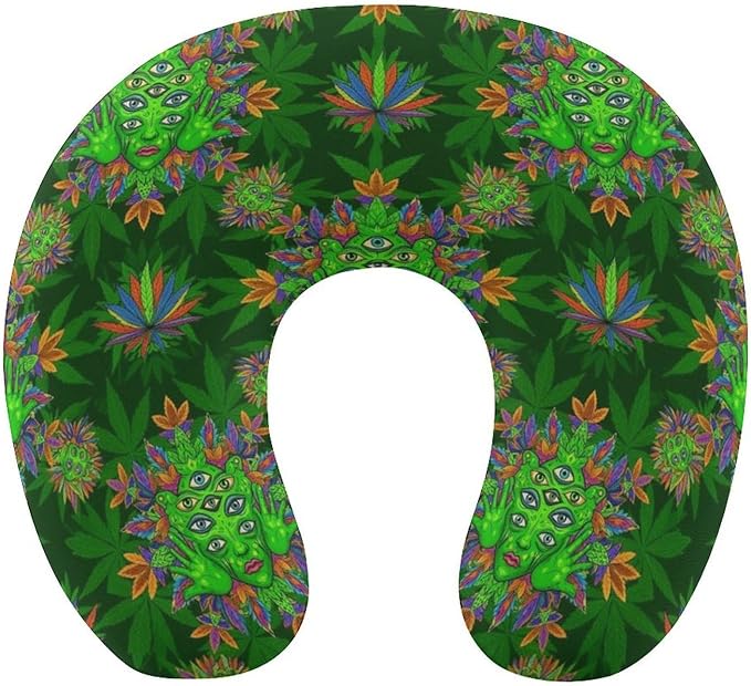 Pain Relief Travel Pillow Memory Foam Chin Support Trippy Eye Leaf Weedleaf Green, Breathable Washable Cover for Airplane Car Office