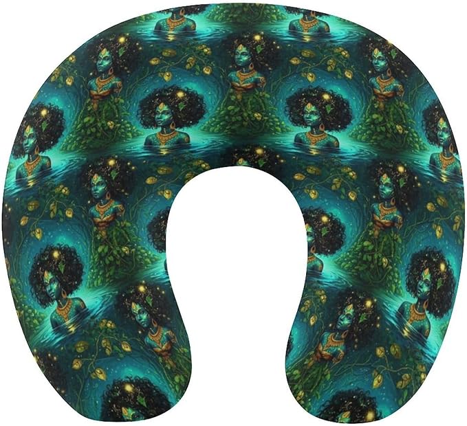 Fashion Travel Pillow Memory Foam Chin Head Support African American Black Woman Girl Art Green, Breathable Washable Cover for Women Men Airplane Car Decor