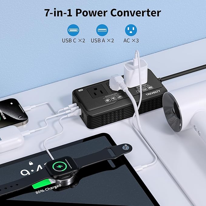 - Silent & Six-Protection Safety: Engineered for peace of mind: This power converter adapter combo operates whisper-quiet while delivering robust protection. Its advanced step down converter features six essential safeguards: Over-charge Protection, Over-current Protection, Over-voltage Protection, Over-temperature Protection, Short-circuit Protection, and Fuse Protection. Safeguard your devices without disruptive noise.